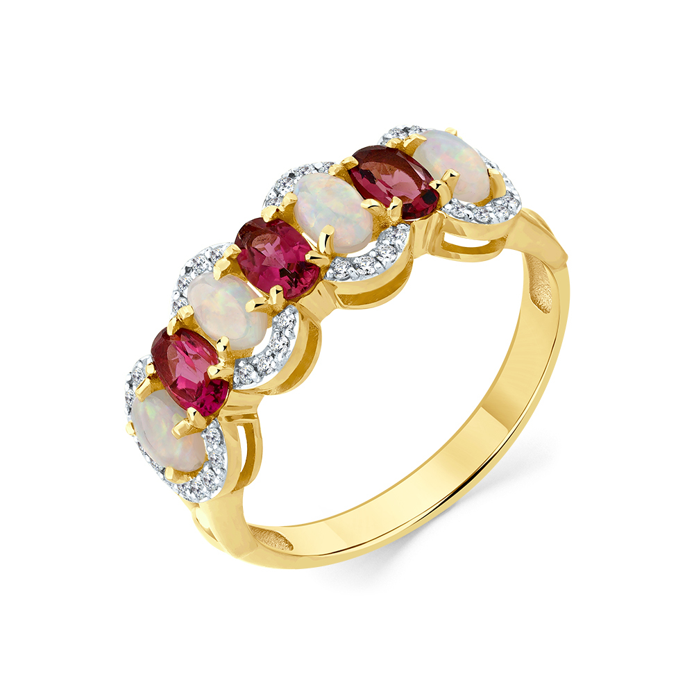 Роскошное кольцо из золота пробы Au 585 – стильный выбор! Настоящая жемчужина коллекции благодаря уникальному сочетанию опала, бриллианта и турмалина. В каждом камне скрыта магия природы, подчеркивающая вашу индивидуальность. Яркий дизайн кольца станет вашим верным спутником как в повседневной жизни, так и на торжественных мероприятиях. Наслаждайтесь восхищенными взглядами окружающих, демонстрируя изысканный вкус и статус.