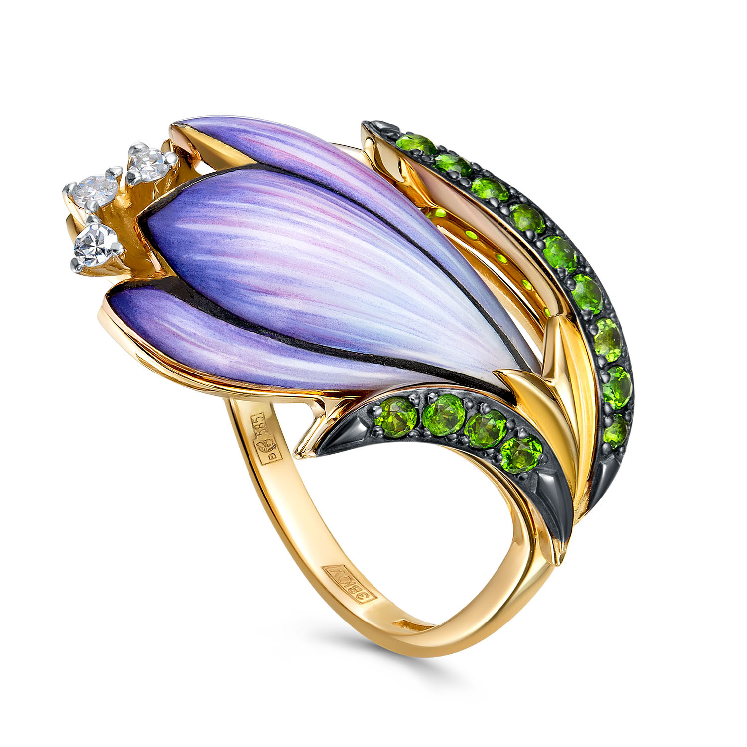 Роскошное кольцо из золота пробы Au 585 – стильный выбор! Настоящая жемчужина коллекции благодаря уникальному сочетанию ярких бриллиантов и чарующего хромдиопсида. Это гармоничное сочетание подчеркивает изысканность образа, придавая ему нотку элегантности и шика. Прекрасно подойдет как повседневное украшение либо станет великолепным подарком близкому человеку. Купите кольцо сейчас и сияйте вместе с ним!