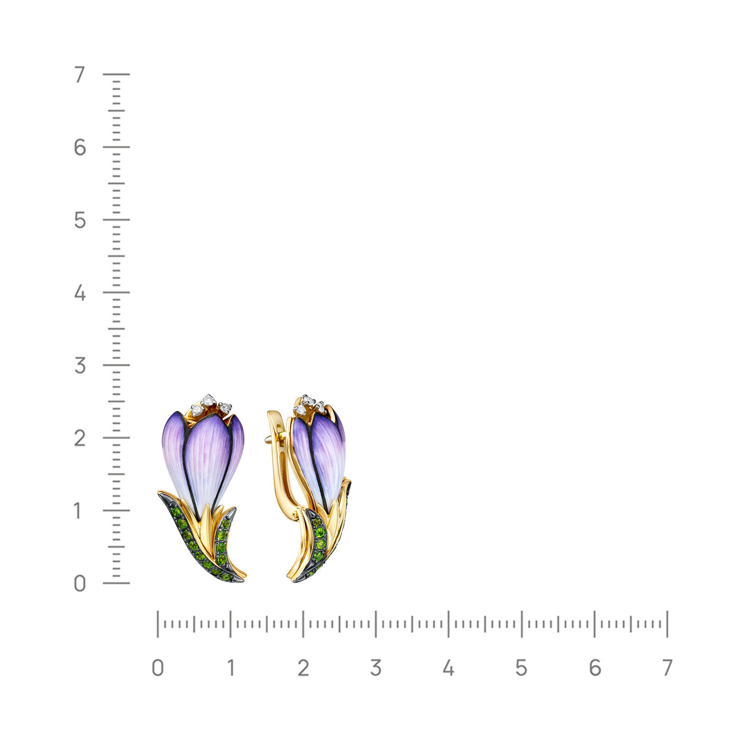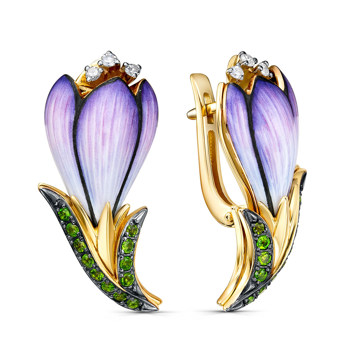 "Сногсшибательные серьги из золота пробы Au 585! Яркие бриллианты обрамлены изысканным хromdiopsidом – символ чистоты отношений и гармонии цвета. Элегантность дизайна подчеркнет вашу индивидуальность и придаст образу незабываемое сияние. Такой аксессуар станет вашим верным спутником как днем, так и вечером, привлекая восторженные взгляды окружающих." Наслаждайтесь каждым моментом в стильных украшениях премиум-класса!"