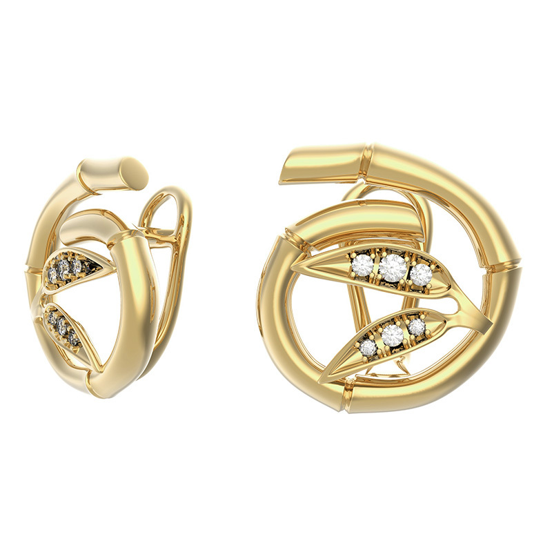 "Серия 'Бамбуковая грация': Серьги из золота пробы Au 585 с сияющими бриллиантами! Элегантность желтого золота подчеркивает утонченность каждого камня, создавая образ роскоши и изысканности. Идеальный аксессуар как для торжественного мероприятия, так и повседневного стиля – подчеркните свою индивидуальность стильно и со вкусом!"