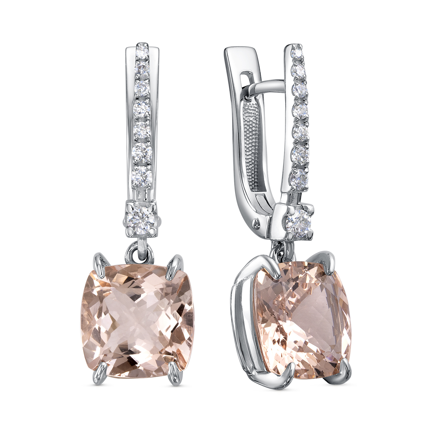Изумительные серьги из белого золота (Au 585), украшенные великолепными бриллиантами и нежным морганитом – стильный выбор истинной модницы! Эти изысканные украшения подчеркнут вашу индивидуальность, придадут образу женственности и шарма. Невероятная игра света на гранях камней привлечет восхищенные взгляды окружающих! Долговечность благородного металла сохранится надолго благодаря высокому качеству изделия. Отличный подарок себе любимой или близкому человеку!
