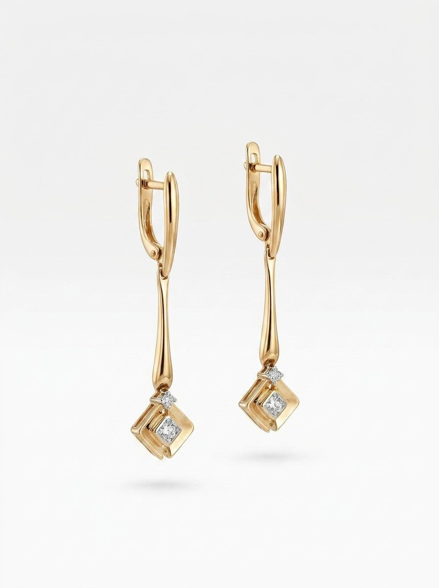 Эти великолепные серьги из золота пробы Au 585 украсятся сверкающими бриллиантами, даря их обладательнице неотразимый блеск и подчеркивая ее изысканный вкус! Яркий акцент вашего образа — элегантность, стиль и роскошь в одном аксессуаре. Носи с гордостью знак внимания к деталям и собственного шарма!